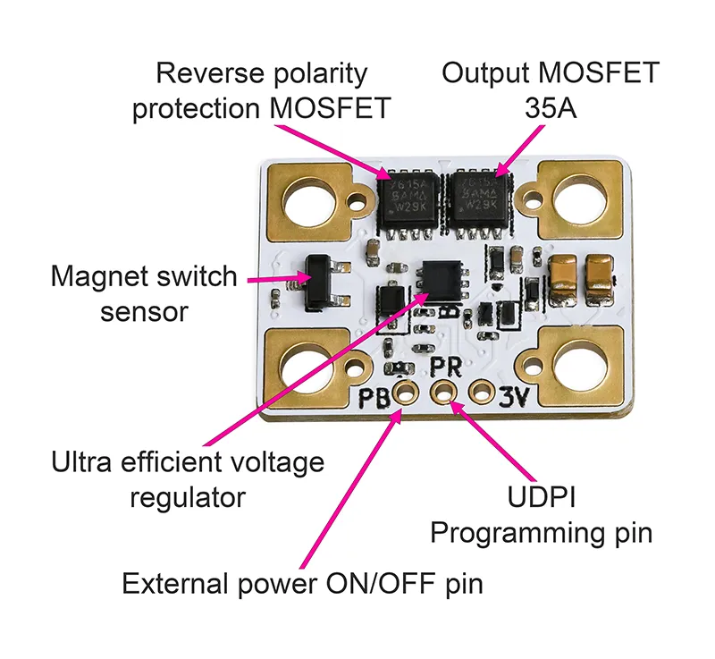 Deska má praktický konektor XT30 pro externí baterii a je dodávána se dvěma deskami s konektory typu push-fit a dvěma 30CM konektorovými kabely.