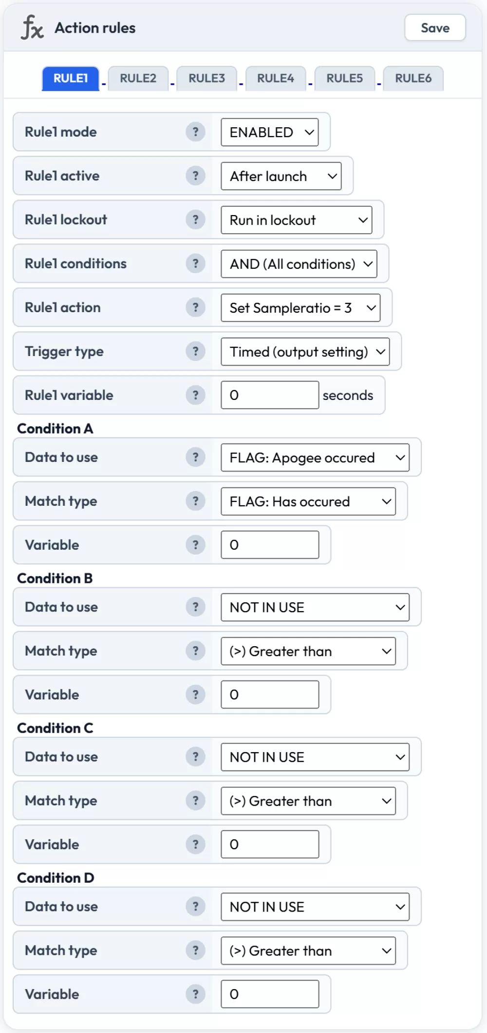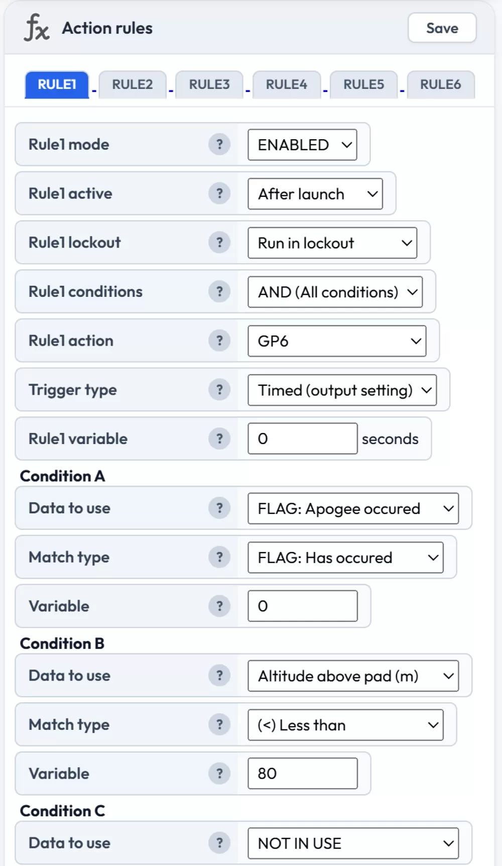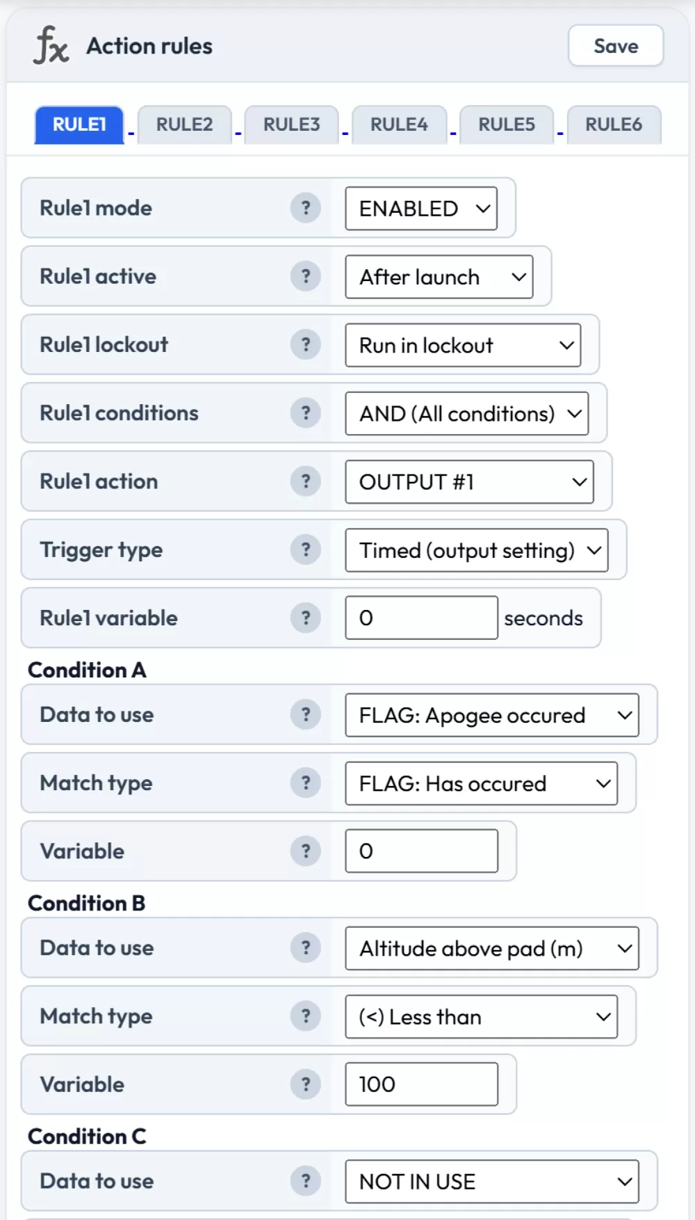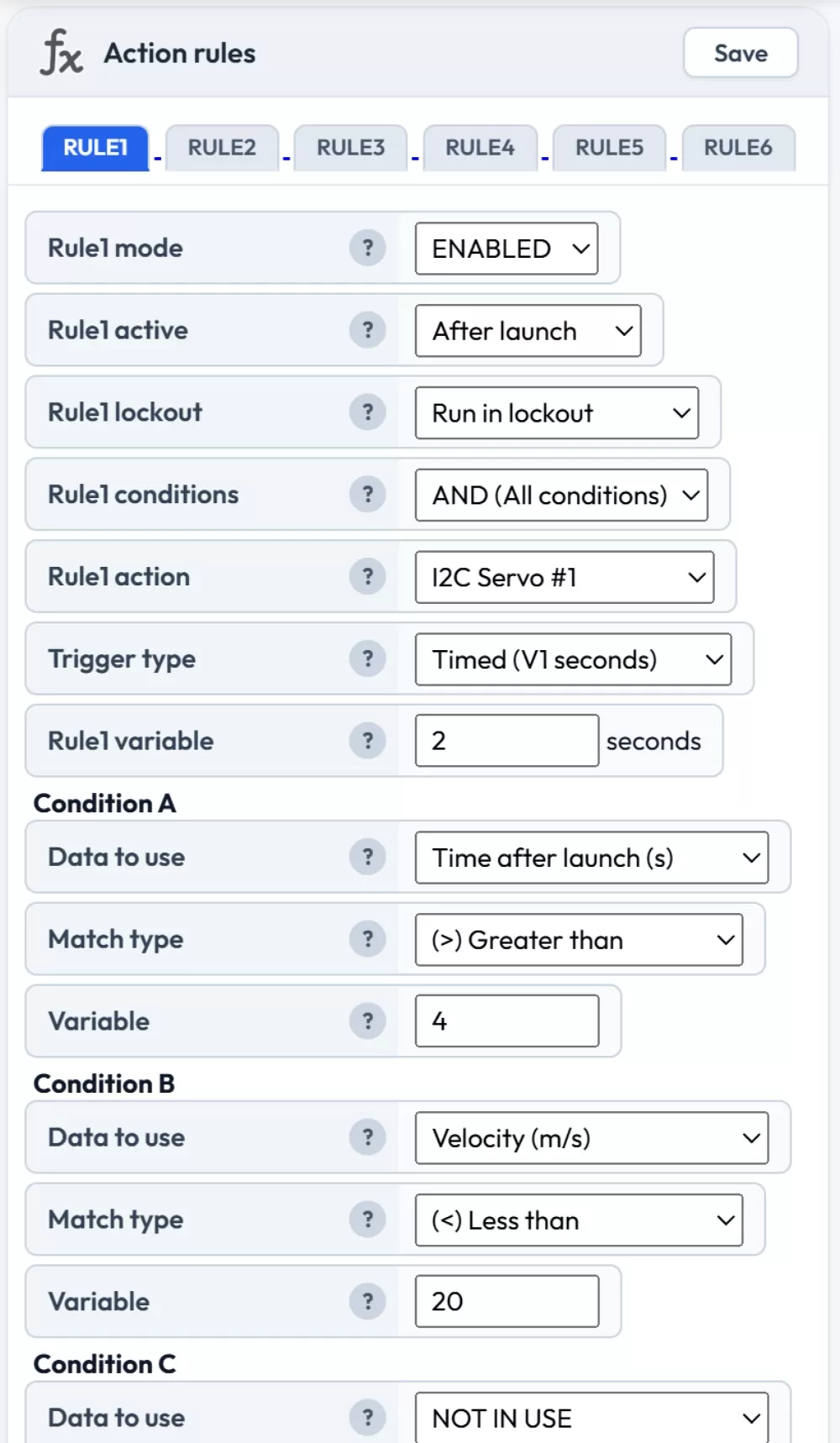The Mercury allows you to configure six custom rules each with up to 4 conditions. These can control outputs, servos, air brakes, and change configuration variables as needed.
