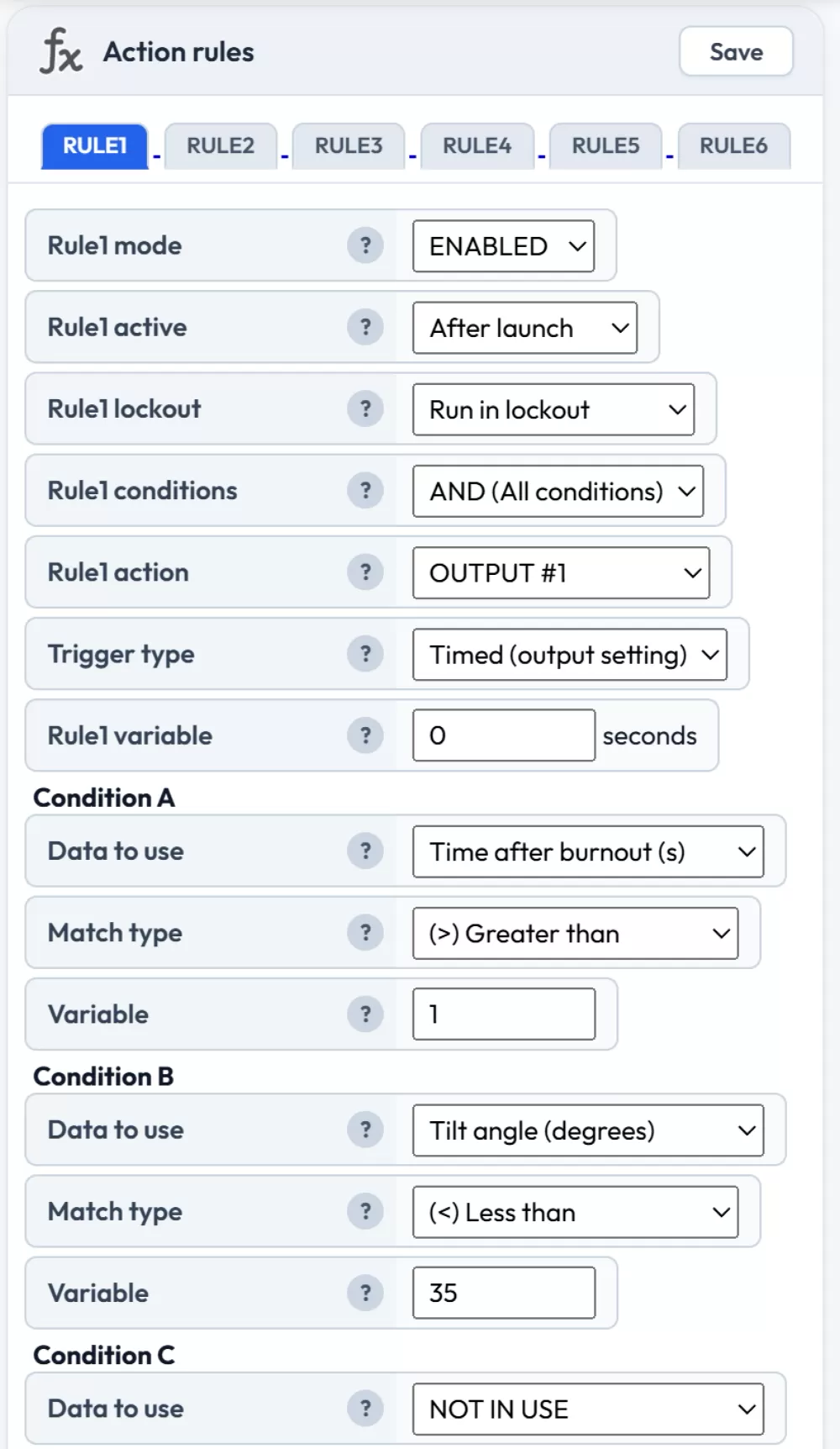 Rule 1: protected air start — fires output 1 second after burnout if tilt is under 35°