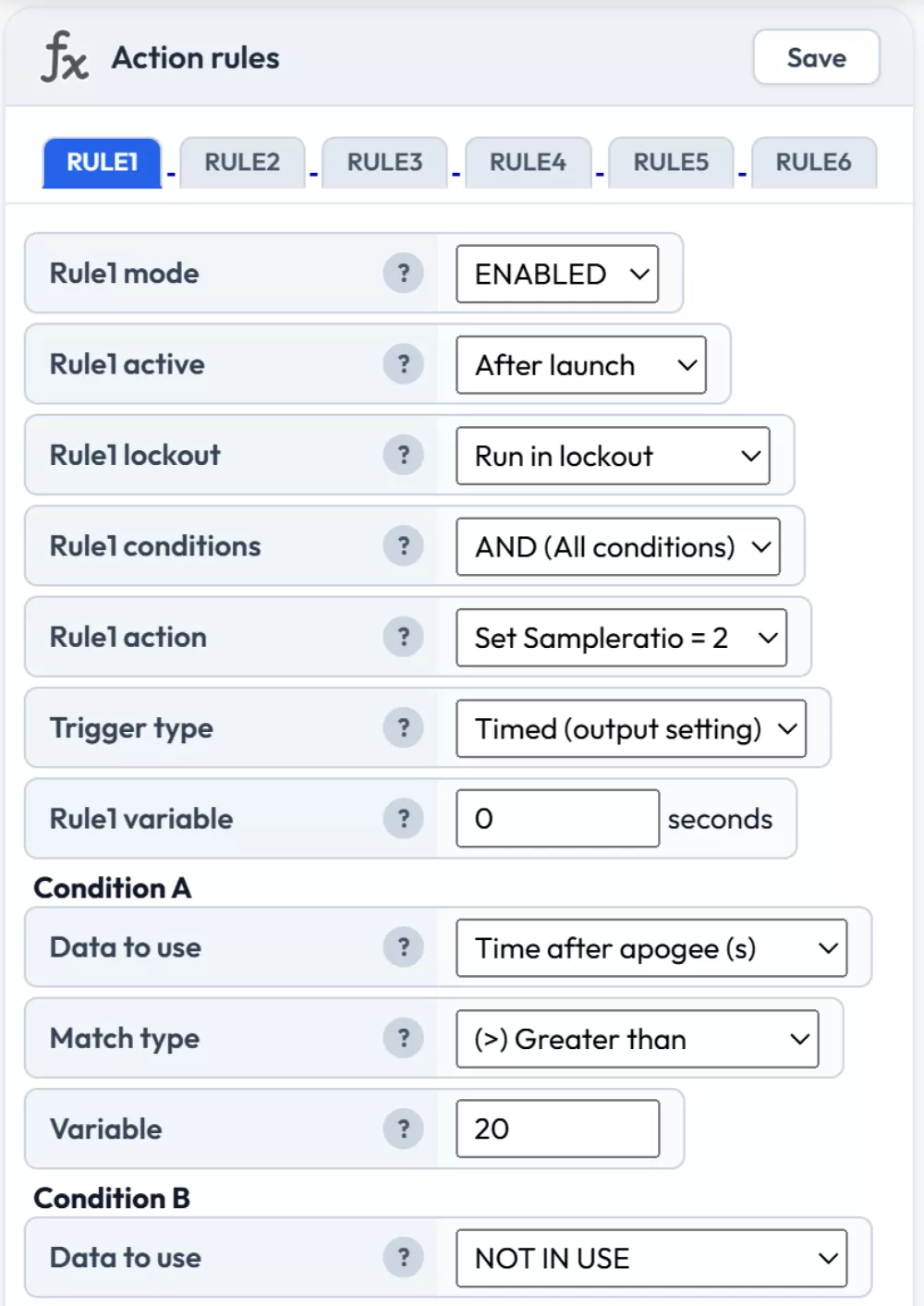 This example drops the logging rate after the active flight phase to extend total recording time. The sample ratio is set to 2 (logging every other sample) when 20 seconds since apogee has passed.