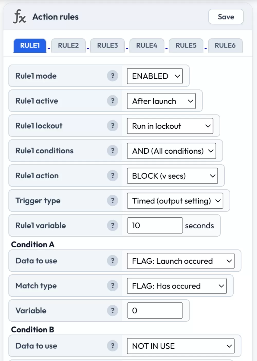 If your rule requires a variable, enter it here. For "BLOCK (v secs)" this is the number of seconds to block. For "Timed (V1 seconds)" this is the on-time in seconds. Outputs and servos that use their own configured on-time don't need this field.