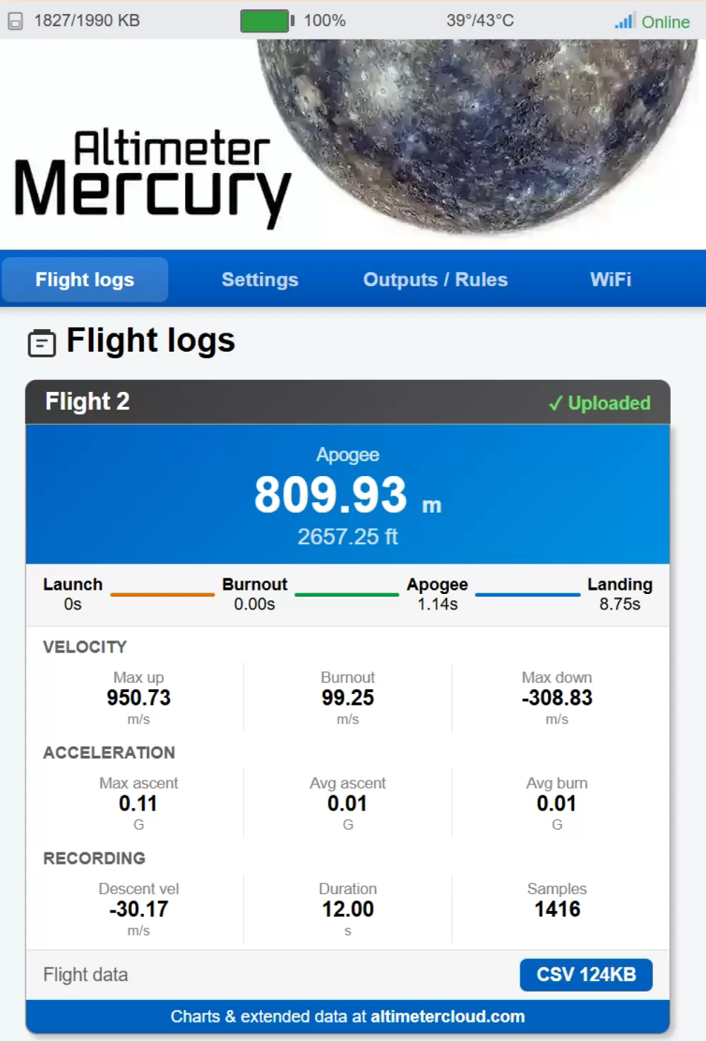 You can view your flight data directly from the Mercury's built-in web server without needing an internet connection. This is useful at the launch site, in the field, or anywhere you don't have WiFi access. All you need is a phone, tablet, or laptop.