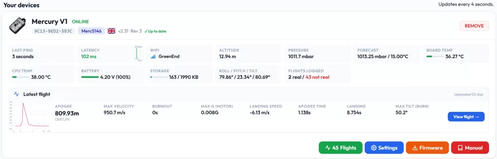 eNOW enables your Mercury to transmit short-range pings after a flight is saved, broadcasting information such as your apogee altitude and battery level. The range is approximately 80 to 300 meters depending on conditions and landing orientation. Requires firmware 2.2 or later.