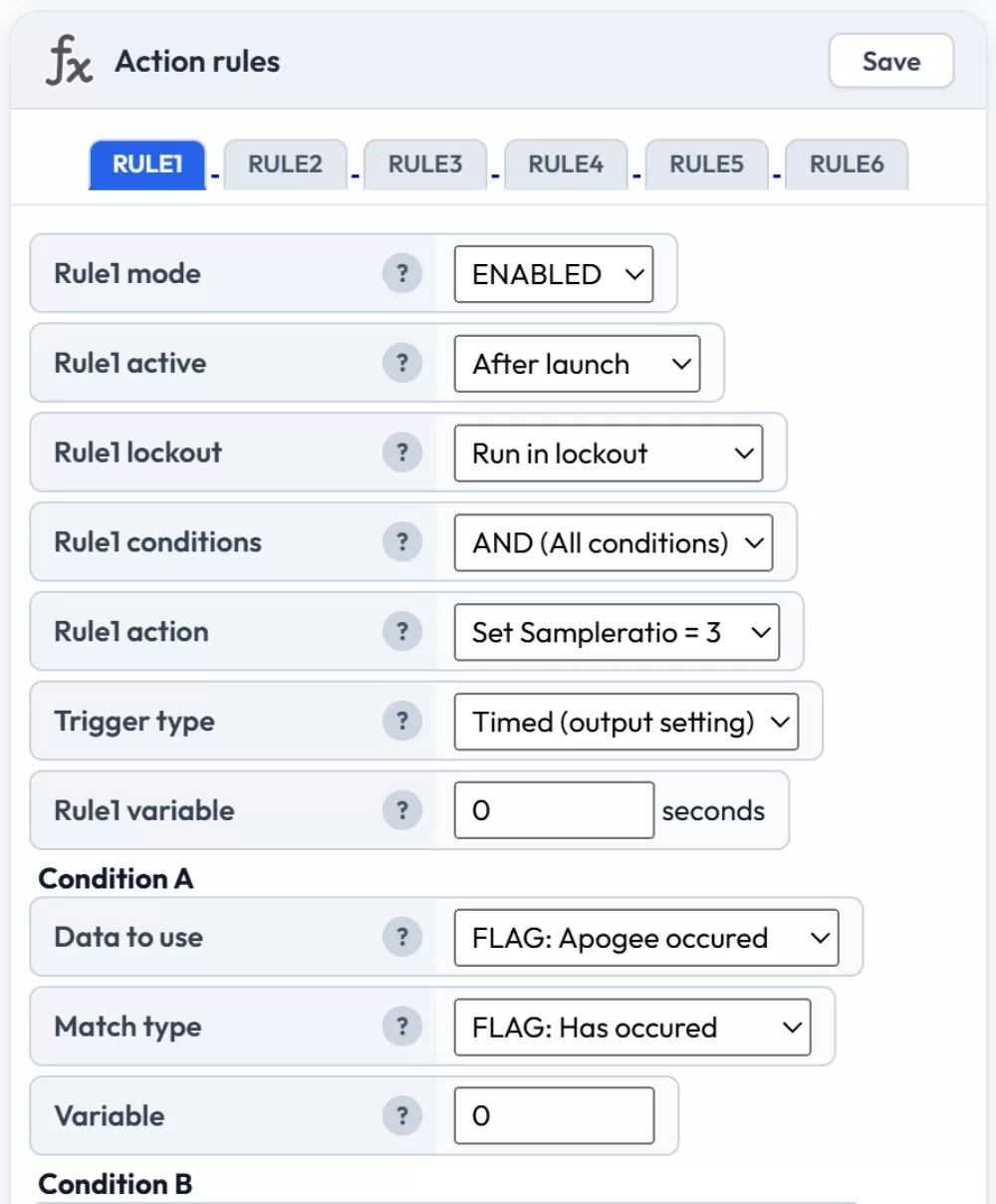 It is also possible to use the Rules system to change the logging rate after specific events or time. For example you could configure a rule to drop the sample ratio after apogee.