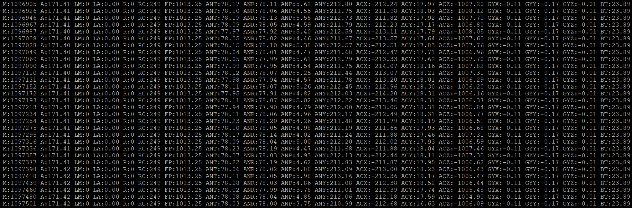 ACX/ACY/ACZ: Acceleration for each axis (-32000 to +32000 mG).